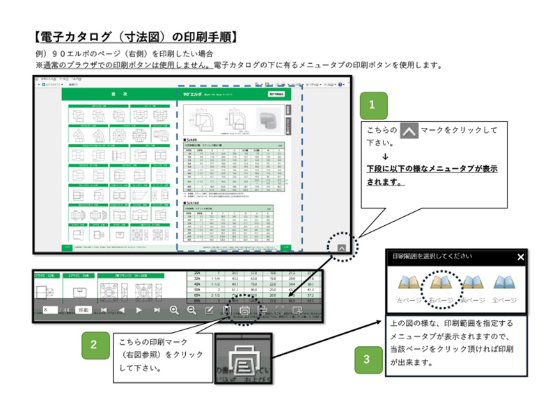 なお、電子カタログ(寸法表)の印刷に関して、印刷ボタンが分かり辛くご迷惑をおかけしております。印刷方法に関しては下記の電子カタログの印刷方法をご参考頂き、印刷・ご活用頂ければ幸いです。 -